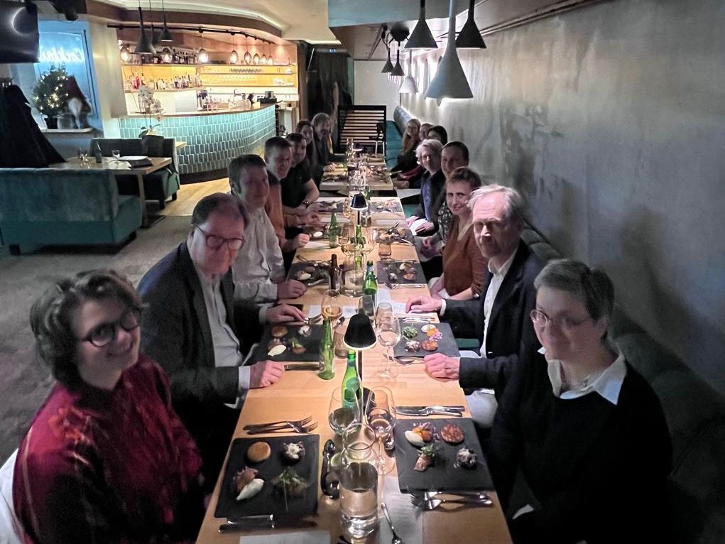 Im Vordergrund sind Projekt Fredrikas Teilzeit- und Sommermitarbeiter (plus Revisor) beim Weihnachtsessen 2025.